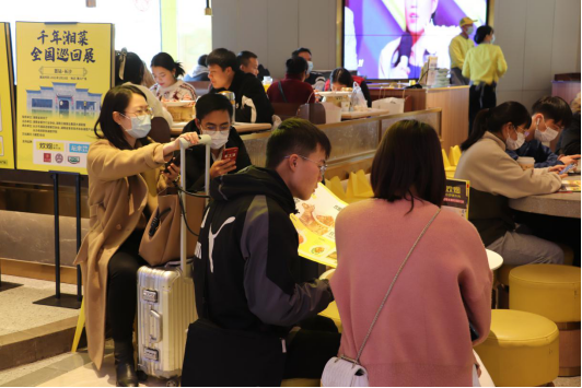 上午十一點,店鋪才開始準備營業(yè),這會兒已經(jīng)有客人在等位了。慢慢地,人也漸漸多了起來,店內(nèi)座無虛席,一輪又一輪,店外還圍著一大圈等待就餐的人,甚至還有拖著行李箱過來打卡的,而且這天還不是周末。據(jù)工作人員介紹,自試運營以來,每天都有很多人過來排隊打卡,一天可達2000多桌。