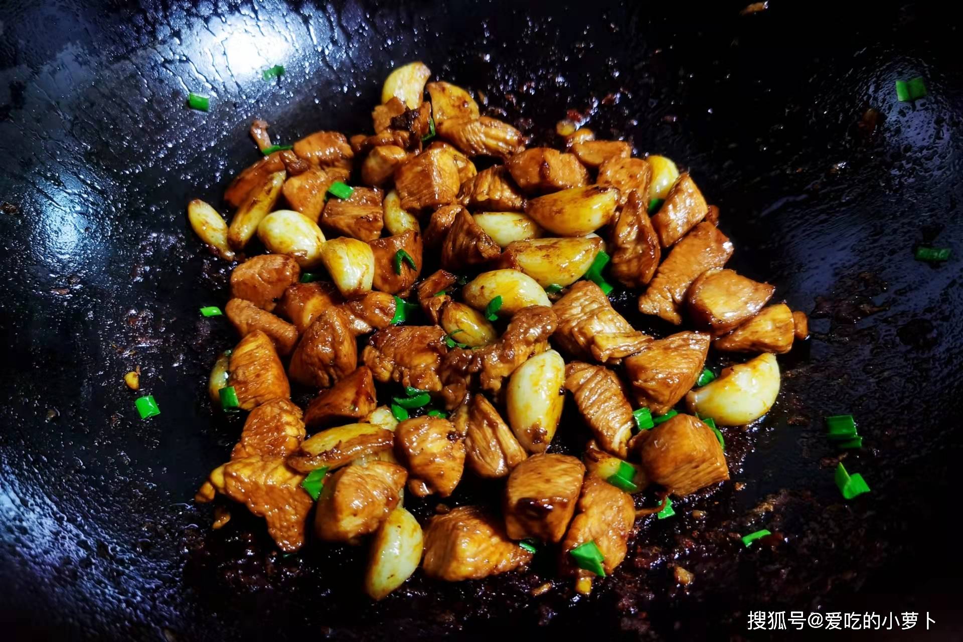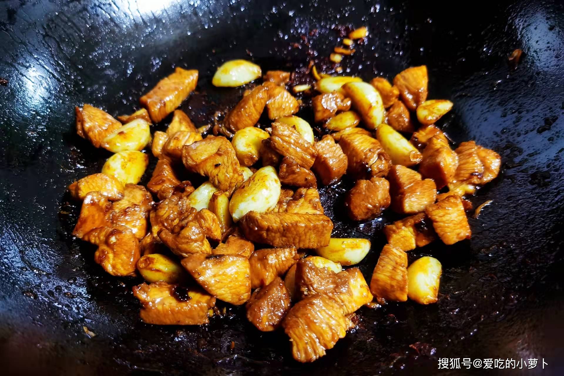 第三步:起炒鍋,鍋中加入適量食用油,待油溫3成熱時(shí),再將備好的大蒜放入炒鍋中,炒至大蒜變軟金黃,接著將腌好的雞胸肉倒入炒鍋中,然后炒至雞胸肉變色熟透,即可。