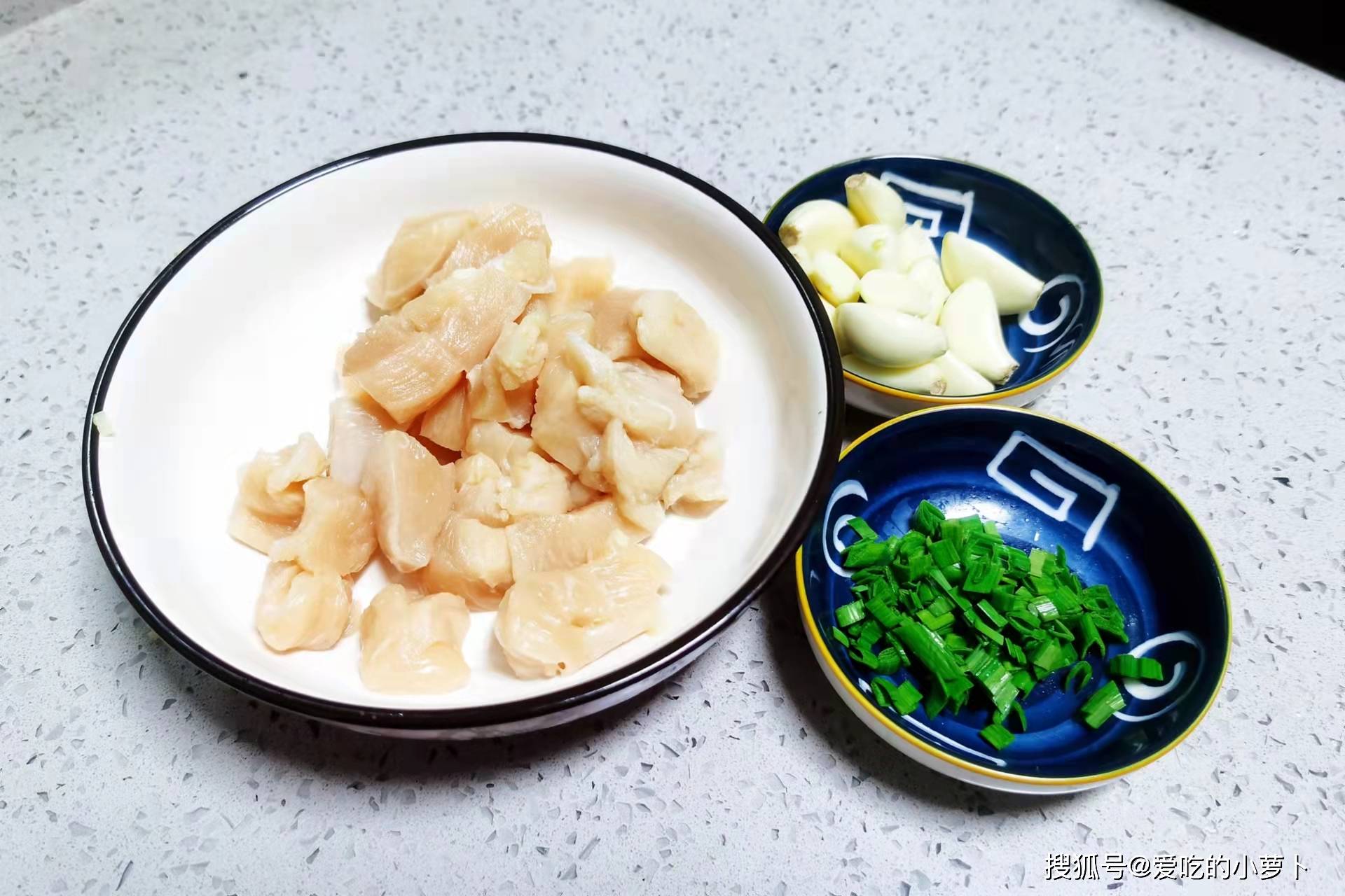 第一步:先將買來(lái)的雞胸肉改刀切小塊,再將大蒜去皮,小蔥清洗干凈,改刀切蔥花,然后將切好的食材裝入盤中,備用。