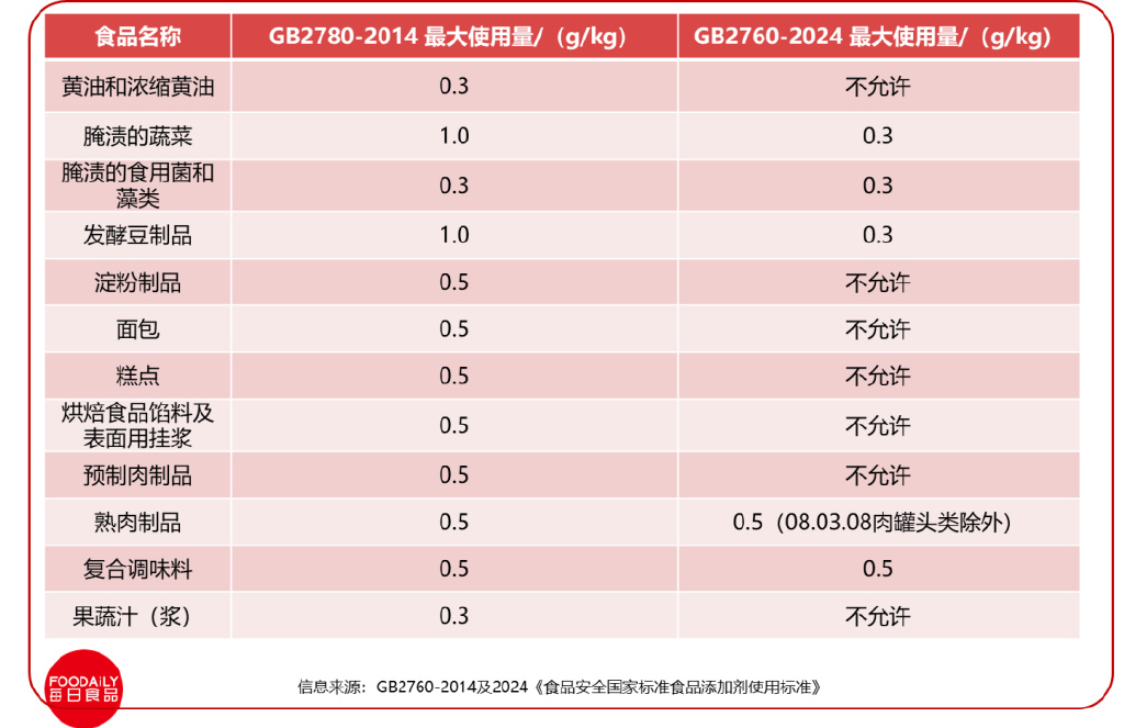 Foodaily注意到:自1998年脫氫乙酸鈉被列入食品添加劑名單中以來(lái),該成分已在國(guó)標(biāo)中沿用26年。但新國(guó)標(biāo)的發(fā)布,對(duì)脫氫乙酸鈉使用范圍和用量進(jìn)行了收緊。