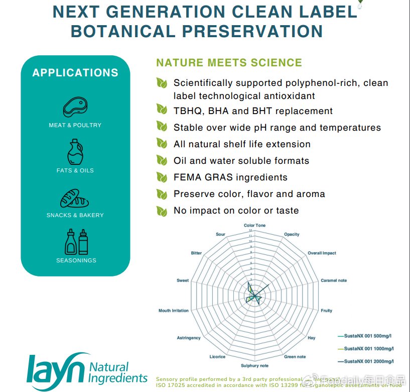 全球領(lǐng)先的植物性功能成分制造商萊茵生物,在2021年推出一款天然防腐劑SustaNX,富含多酚,通過(guò)結(jié)合螯合劑與自由基清除劑,成為EDTA等合成抗氧化劑的有效替代品,并具備顯著的成本效益。