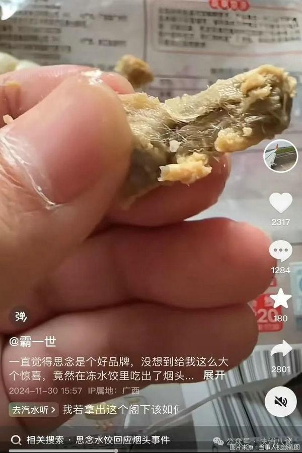 近日,有消費者在社交平臺發(fā)布視頻稱在思念速凍水餃中吃出疑似煙頭的異物。12月2日,北京商報記者嘗試聯(lián)系上述消費者獲得更多信息,但截至發(fā)稿該消費者未與記者有更多溝通。據(jù)該消費者后續(xù)發(fā)布的內(nèi)容,其已與品牌方和經(jīng)銷商取得聯(lián)系,該事件已經(jīng)交給政府處理。
