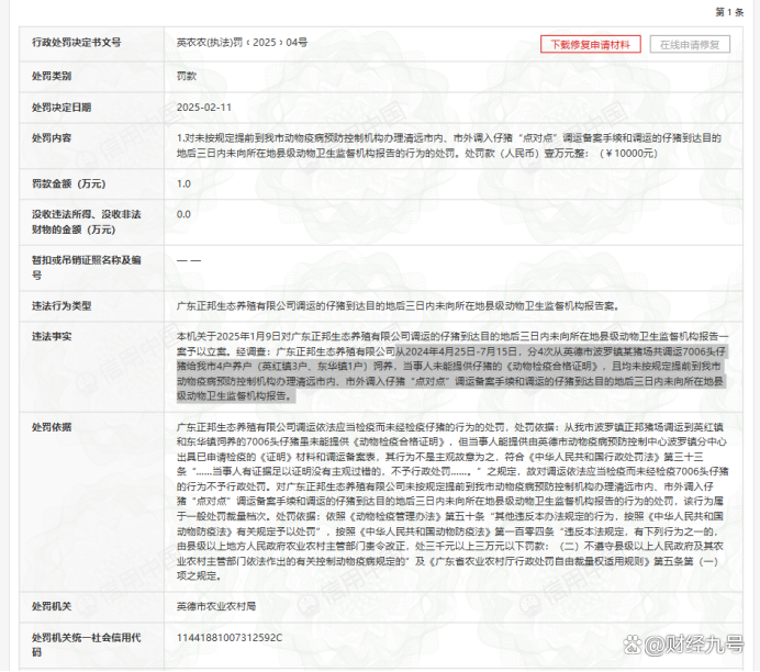 今年2月11日,英德市農(nóng)業(yè)農(nóng)村局發(fā)布了一則針對正邦科技子公司廣東正邦生態(tài)養(yǎng)殖有限公司的罰單顯示:該公司從2024年4月25日-7月15日,分4次從英德市波羅鎮(zhèn)某豬場共調(diào)運(yùn)7006頭仔豬給養(yǎng)殖戶飼養(yǎng),當(dāng)事人未能提供仔豬的《動物檢疫合格證明》,且均未按規(guī)定提前到該市的動物疫病預(yù)防控制機(jī)構(gòu)辦理清遠(yuǎn)市內(nèi)、市外調(diào)入仔豬“點(diǎn)對點(diǎn)”調(diào)運(yùn)備案手續(xù)和調(diào)運(yùn)的仔豬到達(dá)目的地后三日內(nèi)未向所在地縣級動物衛(wèi)生監(jiān)督機(jī)構(gòu)報告,上述違規(guī)行為被處以罰款處罰。