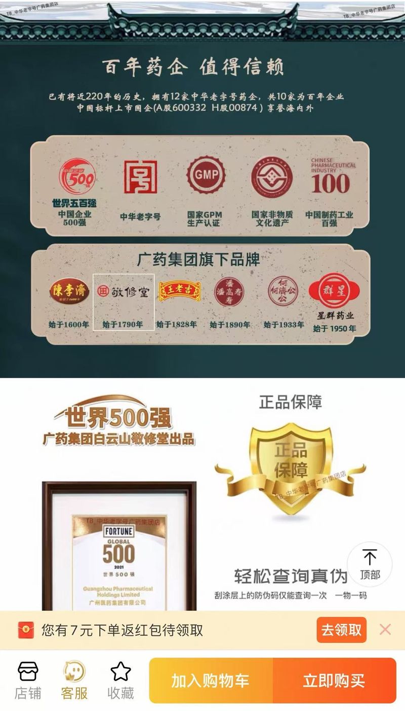 記者還發(fā)現(xiàn),在售賣相關產品時,背后的知名藥企也是商家宣傳的一大“賣點”。上述三款雞內金相關產品的外包裝商標,均明顯標示有白云山、哈藥集團、仁和的品牌標識。其中,中華老字號廣藥集團店更是將廣藥集團作為一大“賣點”專門介紹,提及“已有將近220年的歷史,擁有12家中華老字號藥企業(yè),共10家為百年企業(yè)”,以此來增加產品的可信度。