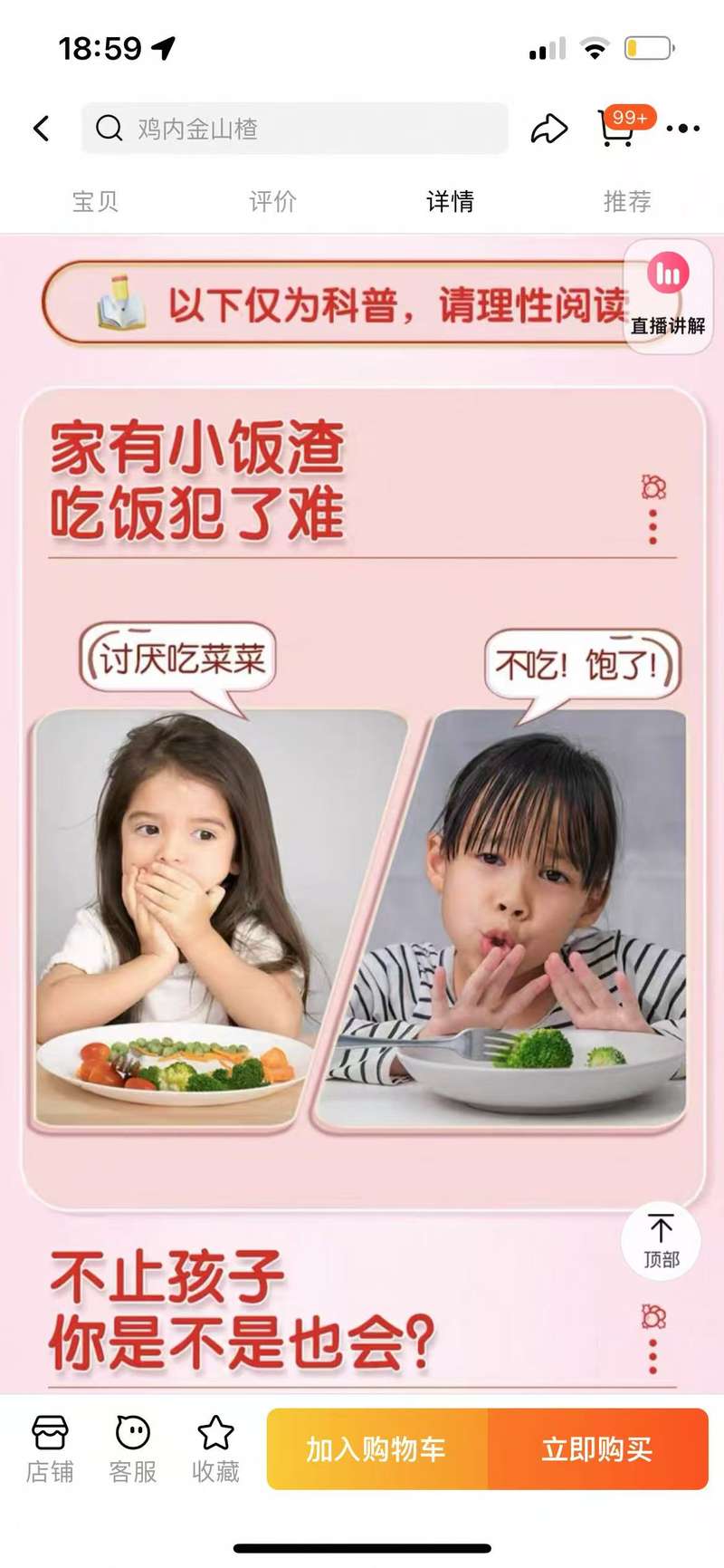其中,在哈藥官方旗艦店的山楂雞內金益生菌咀嚼片的視頻介紹中,提到“孩子老是不愛吃飯,挑食厭食;讓寶寶胃口好,吃飯香;寶寶不愛吃飯的、厭食的、討厭吃菜的,還有大人胡吃海喝的、油膩的,放在家中,就是開胃的小法寶”等內容,店鋪客服也在回答記者關于產品適用情況的咨詢時表示,“不管是大人還是寶寶,脾胃不好、胃口不好、挑食厭食、消化不良、便秘都是非常適宜食用的”,并稱產品“還添加8種益生菌,讓腸道更健康。”