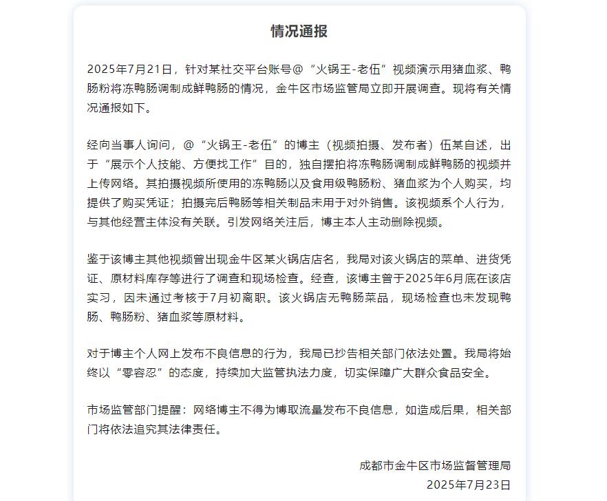 鑒于該博主其他視頻曾出現(xiàn)金牛區(qū)某火鍋店店名,我局對(duì)該火鍋店的菜單、進(jìn)貨憑證、原材料庫存等進(jìn)行了調(diào)查和現(xiàn)場檢查。經(jīng)查,該博主曾于2025年6月底在該店實(shí)習(xí),因未通過考核于7月初離職。該火鍋店無鴨腸菜品,現(xiàn)場檢查也未發(fā)現(xiàn)鴨腸、鴨腸粉、豬血漿等原材料。