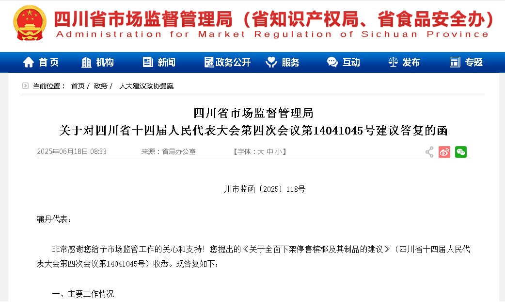 非常感謝您給予市場(chǎng)監(jiān)管工作的關(guān)心和支持!您提出的《關(guān)于全面下架停售檳榔及其制品的建議》(四川省十四屆人民代表大會(huì)第四次會(huì)議第14041045號(hào))收悉?,F(xiàn)答復(fù)如下: