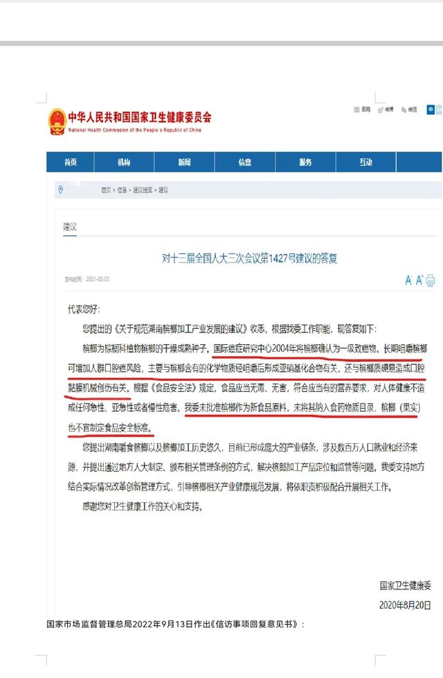 王海說:“國家衛(wèi)生健康委未批準(zhǔn)檳榔作為新食品原料,未將其納入食藥物質(zhì)目錄,檳榔(果實(shí))也不宜制定食品安全標(biāo)準(zhǔn)。國際癌癥研究中心2004年將檳榔確認(rèn)為一級(jí)致癌物,長期咀嚼檳榔可增加患口腔癌風(fēng)險(xiǎn)。”