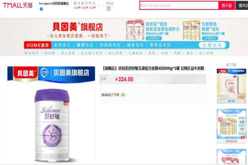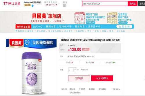 在天貓商城售賣的貝因美牌舒好敏“兒童營(yíng)養(yǎng)配方奶粉”。