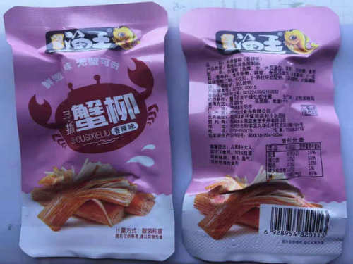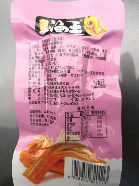 汪先生購(gòu)買(mǎi)的洞庭漁王牌手撕蟹柳的產(chǎn)品標(biāo)簽上顯示,該產(chǎn)品的配料為:仿蟹柳(魚(yú)糜、水、大豆蛋白、蛋清)、白砂糖、食用鹽、香辛料、食用香精、辣椒、食品添加劑(谷氨酸鈉、5′-呈味核苷酸二鈉、卡拉膠、D-異抗壞血酸鈉、三聚磷酸鈉、六偏磷酸鈉、焦磷酸鈉、雙乙酸鈉);產(chǎn)品類型為即食風(fēng)味魚(yú)糜制品;食用方法為開(kāi)袋即食;委托生產(chǎn)商為岳陽(yáng)市東洞庭漁王食品有限公司;生產(chǎn)商為湖南大成食品有限公司。