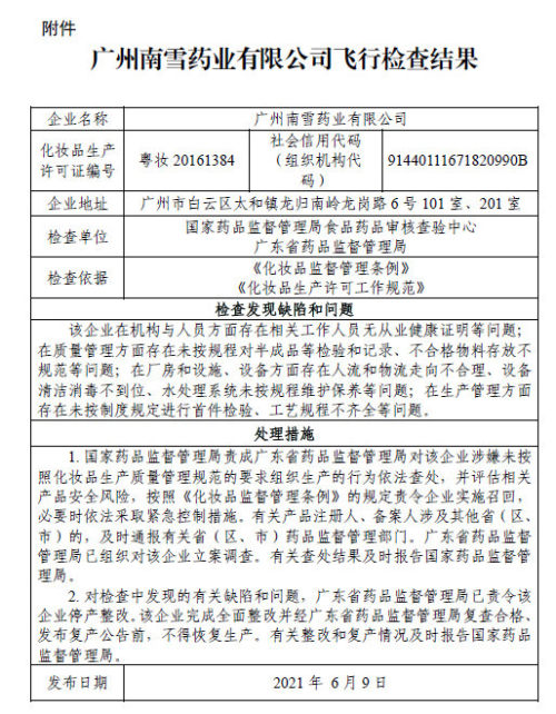 一波未平,一波又起。6月11日,國家藥品監(jiān)督管理局發(fā)布關(guān)于廣州南雪藥業(yè)有限公司飛行檢查結(jié)果的通告,由于該企業(yè)違反了《化妝品監(jiān)督管理條例》、《化妝品生產(chǎn)許可工作規(guī)范》等有關(guān)規(guī)定,該局已責(zé)成廣東省藥品監(jiān)督管理局責(zé)令該企業(yè)停產(chǎn)整改,并對該企業(yè)立案調(diào)查。